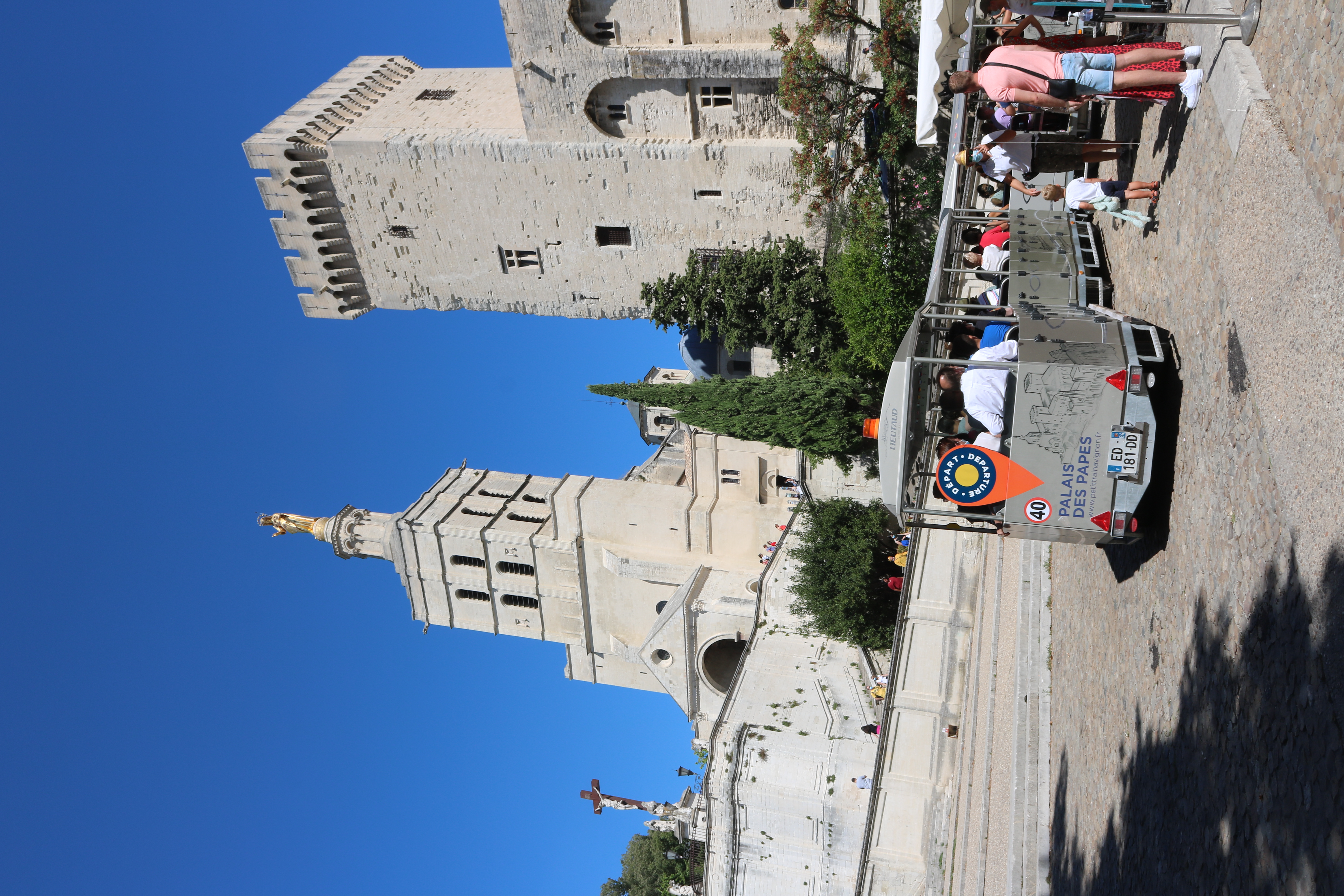 Semée de clochers surgissant au milieu des toits rosés, elle est entourée de remparts et dominée par le rocher des Doms sur lequel s'étirent majestueusement la cathédrale et le Palais des Papes.