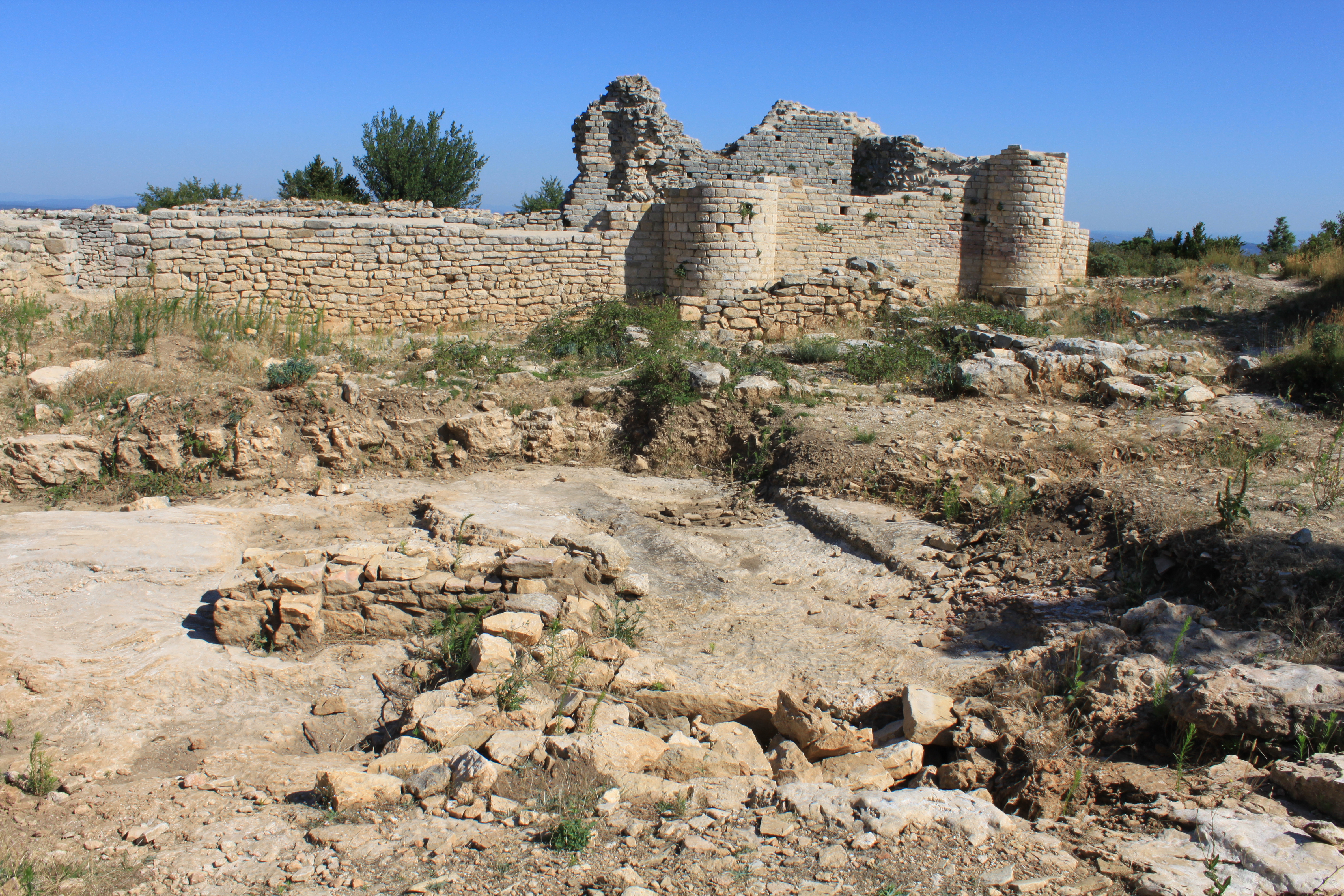 L'enceinte : Un nouveau rempart sas grande valeur défensive, est construit directement sur le rocher calcaire. Parée de tours et de portes, cette enceinte délimite le quartier haut de l'agglomération romaine. Son élévation et son état de conservation sont encore exceptionnels.