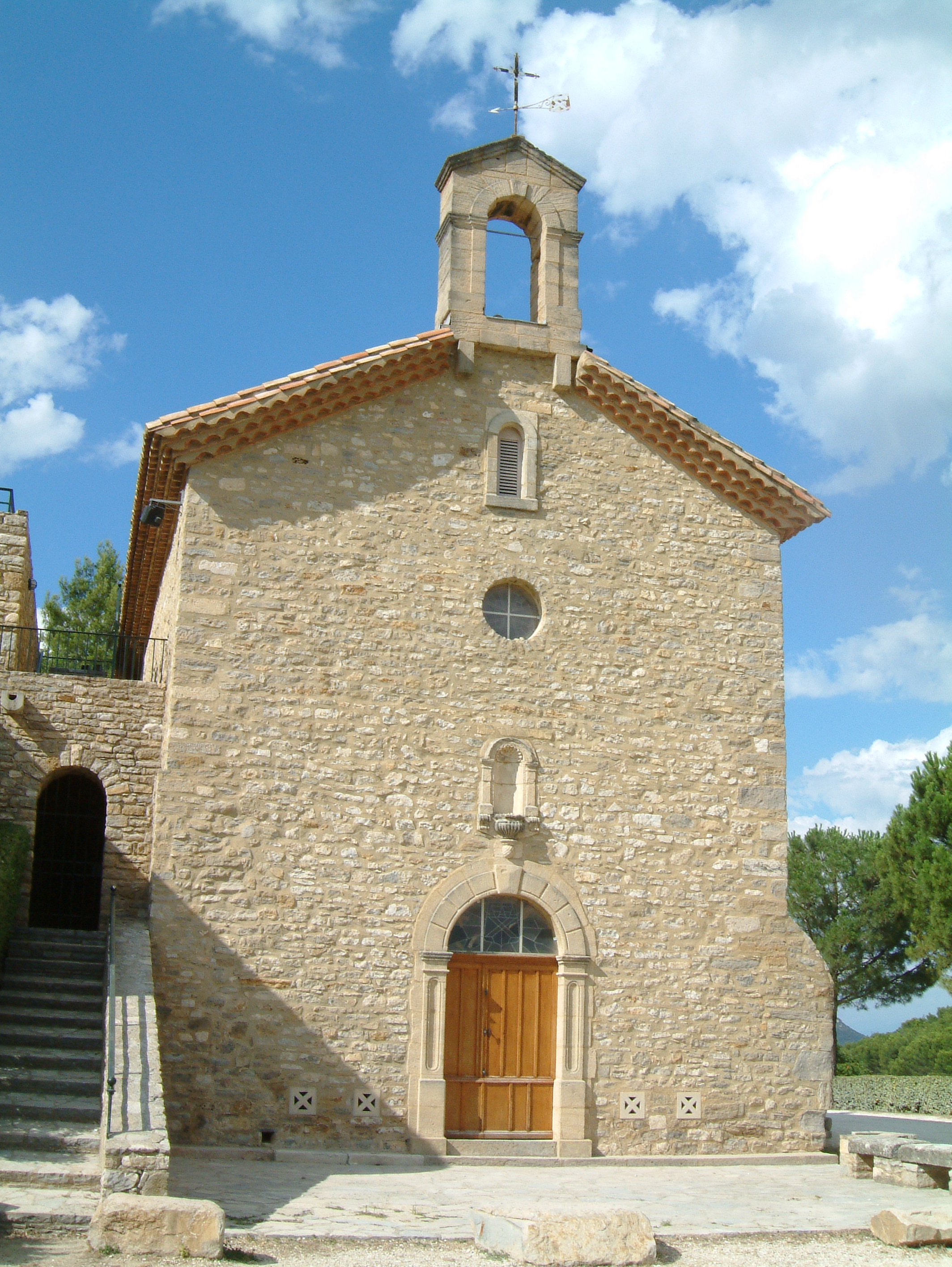 Chapelle Saint-Géniès de Laudun-l'Ardoise. : La chapelle, excentrée par rapport au village, se dresse au centre du cimetière de Laudun-l'Ardoise, au sud de la ville. La chapelle est édifiée en moellons et est recouverte d'une toiture en bâtière composée de lauzes. Au sud, la chapelle présente une austère façade, qui est en fait, rappelons-le, la façade sud du transept de l'église paroissiale originelle. Cette façade est percée d'une seule baie cintrée dont les claveaux et les piédroits sont réalisés en pierre de taille. Au nord, elle est percée d'un grand arc cintré qui assurait en fait la communication entre le bras sud du transept et la nef d'origine, aujourd'hui disparue. À l'est, la chapelle présente un chevet roman constitué d'une abside semi-circulaire sans autre ornementation qu'une fenêtre axiale cintrée sans ébrasement dont les claveaux et les piédroits sont réalisés en pierre de taille de belle facture, et nettement plus visibles que sur la façade sud.