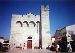 Dans son testament de 542, saint Césaire, évêque d’Arles, mentionne une église dédiée à Notre Dame du Radeau. De dimensions modestes – on parle d’environ 15 mètres – elle était fermée devant par une grille de fer et sur les trois autres cotés par une muraille de pierre de taille. Elle occupait la partie centrale de la nef actuelle, touchant le chœur. On l’avait construite autour du puits que l’on peut toujours voir de nos jours car la tradition disait que les Saintes avaient élevé là un autel à la Sainte Vierge, le premier sur la terre des Gaules, et avaient vécu près de ce puits.